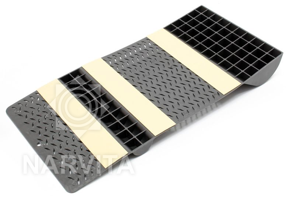 52,8 x 25 cm ratų stabdiklis pagamintas iš patvaraus plastiko (polipropileno) ir gali būti tiesiog priklijuotas prie žemės dėl lipnios apačios. Kilimėlį taip pat galite pritvirtinti prie žemės dėl iš anksto išgręžtų skylių (tvirtinimo medžiagos nepridedamos).