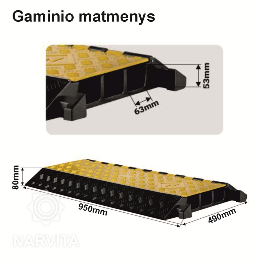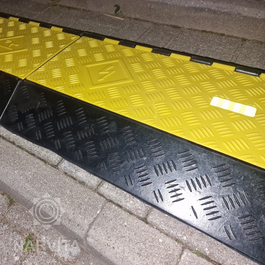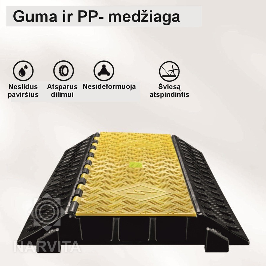 Trijų kanalų kabelinis tiltas: saugi ir patikima kabelių apsauga. Galite naudoti kabelių tiltelį, kad apsaugotumėte kabelius nuo sunkiosios technikos pažeidimų.  Sukurta atlaikyti dideles apkrovas. Grindų kabelių apsauga pagaminta iš aukštos kokybės gumos ir polipropileno, todėl ji gali atlaikyti dideles apkrovas ir optimaliai apsaugoti jūsų kabelius. Nesvarbu, ar naudojama sandėlyje, gamykloje, ar intensyvaus eismo vietose, ši kabelių jungtis užtikrina jūsų kabelių saugumą. Tvirta konstrukcija užtikrina ilgalaikį patvarumą tiek patalpose, tiek lauke. Viena iš išskirtinių savybių – išskirtinė keliamoji galia. Jis gali atlaikyti iki 30 tonų svorį, todėl idealiai tinka vietovėms, kuriose naudojama sunki technika. Ši įspūdinga keliamoji galia užtikrina, kad jūsų kabeliai būtų apsaugoti nuo bet kokios galimos žalos, be to, sumažins brangaus remonto ar keitimo riziką. Kabelio apsauga sukurta su neslystančiu pagrindu, kad būtų užtikrintas maksimalus stabilumas ir tvirtai laikytųsi vietoje net ir esant dideliems kroviniams. Ši savybė ne tik apsaugo laidus, bet ir sumažina nelaimingų atsitikimų riziką, nes neleidžia jiems pajudėti ar paslysti. Todėl tai puikus pasirinkimas judrioms darbo vietoms.  Šis trijų kanalų kabelių apsaugos tiltas yra praktiško dizaino, todėl jame yra daug vietos jūsų kabeliams. Jį taip pat galima lengvai prijungti prie kitų kabelių tiltelių. Tai suteikia galimybę prireikus prailginti kabelių apsaugos įtaiso ilgį. Dėl to jis idealiai tinka įvairiems pritaikymams – tiek laikinam naudojimui renginiuose, tiek nuolatiniam montavimui gamyklose ir sandėliuose. Dėl tvirtos konstrukcijos šį kabelių tiltą galite naudoti tiek vidaus, tiek lauko viešosiose erdvėse. Nesvarbu, ar jums reikia apsaugoti kabelius statybvietėje, sandėlyje, ar viešajame take, šis kabelių tiltas apsaugos jūsų kabelius nuo pažeidimų ir užkirs kelią nelaimingiems atsitikimams, tokiems kaip paslydimai ir kritimai. Taip turi per vidurį šviesą atspindinčią juostą, kuri tamsoje padeda geriau matyti kabelio tiltą ir neužkliūti. 95 x 49 x 8 cm dydžio  trijų kanalų kabelinis tiltas yra pakankamai kompaktiškas, kad būtų lengvai pastatomas ten, kur reikia, ir suteikia daug vietos uždengti kelis kabelius. Kabelio apsauga nėra labai didelė, todėl transporto priemonės ir pėstieji gali juo be jokių sunkumų pravažiuoti.