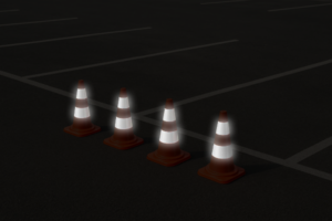 Signaliniai kūgiai parkinge tamsoje
